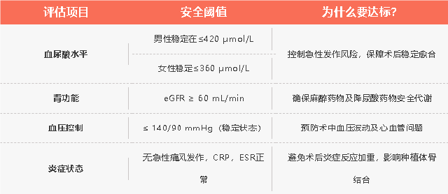 痛风患者种牙的风险,核心源于全身性的生理异常和用药影响,并非“不能种”,而是需要更精准的评估和更细致的防护!在种牙前,必须进行系统评估,确保四大关键指标处于安全范围内: