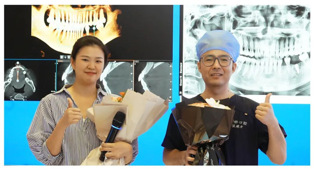 随后,成功种牙的陆女士也来到台前,向所有观众分享自己的手术体验:“因为我的家人已经在新桥口腔成功种牙,所以我对此次手术是期待大于恐惧的。实际体验下来,整个过程几乎没有痛感,而且很快很轻松,这也让我更相信新桥口腔的实力与口碑!”