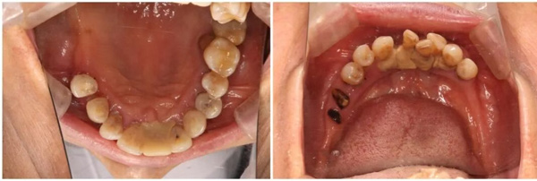 经CBCT及口内检查,王锋医生发现章阿姨全口余留牙存在严重牙周问题,牙龈红肿、萎缩严重,牙根大面积外露,牙结石沉积显著,上下颌多数牙呈不同程度松动。