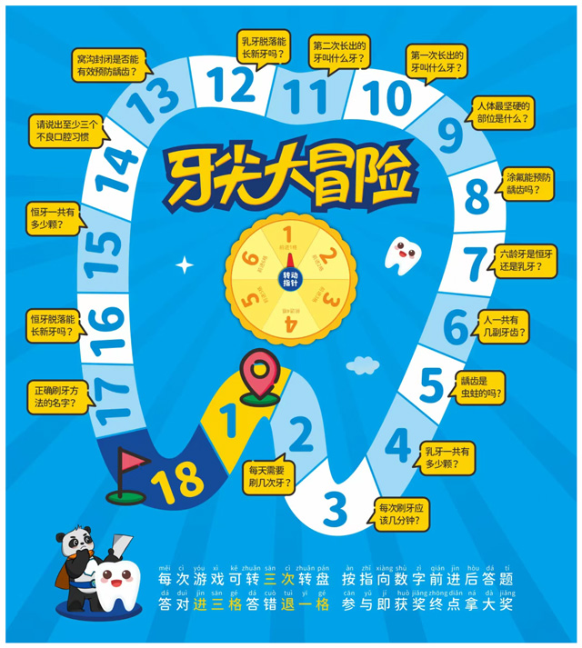 该科普教具以代表口腔特色的牙齿图案为游戏棋盘,每个格子都设置了贴近儿童认知的口腔健康知识小问答,比如“乳牙一共有多少颗?”“乳牙脱落能长新牙吗?”“六龄牙是乳牙还是恒牙?”“每次刷牙应该几分钟?”……引导孩子们在闯关冒险的游玩过程中主动思考、探索答案,于潜移默化中掌握正确的口腔健康知识,真正实现“玩中学、学中记”。