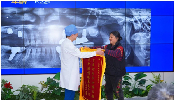 直播现场,不乏有充满感激与信任的回馈。在新桥口腔种好牙的吴女士坦言道:“其实我挺害怕种牙的,此前也走访过许多口腔机构,最终选择新桥口腔,是因为医生及各个工作人员专业又暖心,这在很大程度上打消了我的顾虑。”吴女士还为其手术医生李阳军主任送上致谢锦旗:“我有糖尿病、高血压等基础疾病,原以为不能种牙,但李主任技术非常高超,很轻松就完成了手术,我非常感谢他!”新桥口腔始终坚持以精湛医疗技术为根基、以人性化服务体验为纽带,这份对品质与温度的双重坚守,使其在广大缺牙人士中积累了深厚的信任基础,收获源源不断的好评与赞誉。